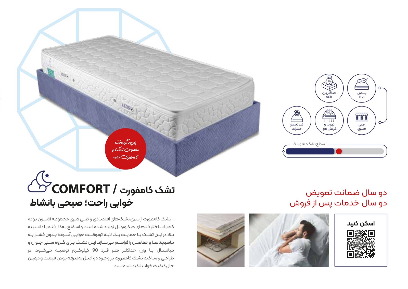 تشک کامفورت | COMFORT یک محصول دارای سیستم فنربندی میکرو پکت اسپرینگ ۵ ناحیه‌ای (5 zone pocket spring) است که باعث می‌ شود وزن و فشار بدن شما در ۵ ناحیه تشک تفکیک شود و فشار زیادی به بدن شما وارد نشود. همچنین حالت فرم گیری دقیق و راحتی را در هنگام خواب شما داشته باشد. تعداد فنرهای کار شده در این تشک ۱۶۱۰ عدد می باشد. تشک کامفورت | COMFORT در هر متر مربع توانایی تحمل ۱۱۰ کیلوگرم وزن دارد. تشک های کامفورت به دلیل دارا بودن تعداد مناسبی از فنر و همچنین ترکیب فنر با لایه های اسفنج و نمد، یکی از انواع تشک های مناسب برای افراد با مشکلات کمردرد هستند