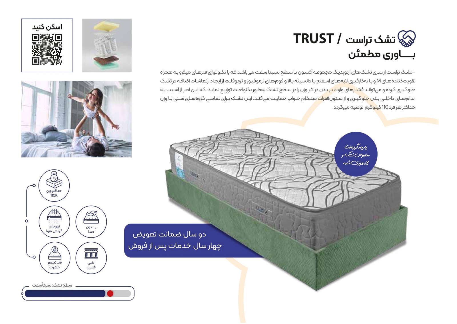 تشک تراست TRUST محصولی ویژه است که می تواند به شما اطمینان دهد با خرید آن می توانید خواب راحت و متفاوتی را تجربه کنید. این تشک انعطاف پذیری بالایی دارد و زمانی که روی آن دراز می کشید، می توانید آزاد سازی تنش های عضلانی را احساس کنید و همین امر اثر بسیار زیادی در آرامش روانی و جسمانی دارد.