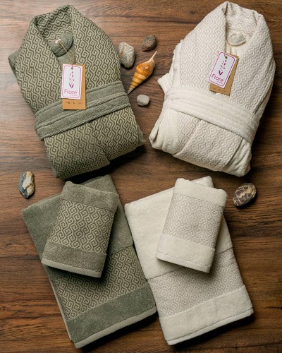 مشخصات ست حوله عروس و داماد دو قلو 10 تکه fiore مدل آنیل سبز سدری کرم سایز M-L