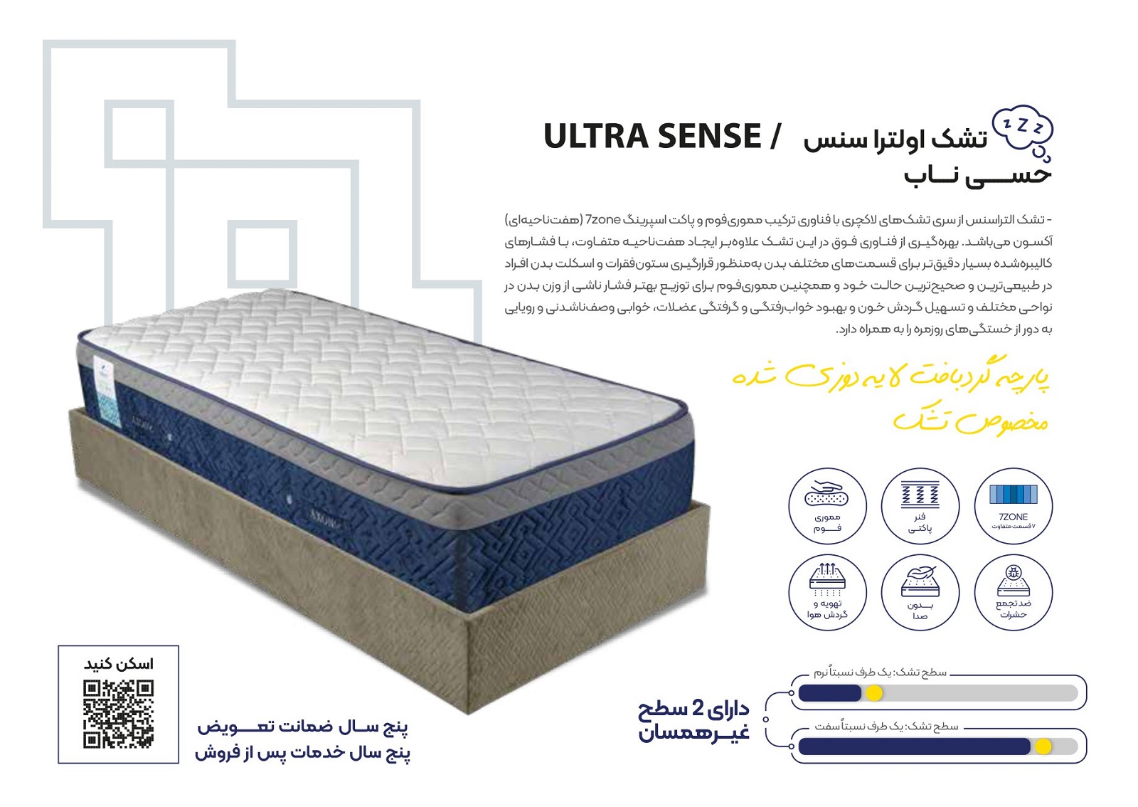 تشک الترا سنس از سری تشک های لاکچری با فناوری ترکیب مموری فوم و پاکت اسپرینگ 7zone (هفت ناحیه ای) آکسون می باشد. بهره گیری از فناوری فوق در این تشک علاوه بر ایجاد هفت ناحیه متفاوت، با فشارهای کالیبره شده بسیار دقیق تر برای قسمت های مختلف بدن به منظور قرارگیری ستون فقرات و اسکلت بدن افراد در طبیعی ترین و صحیح ترین حالت خود و همچنین مموری فوم برای توزیع بهتر فشار ناشی از وزن بدن در نواحی مختلف و تسهیل گردش خون و بهبود خواب رفتگی و گرفتگی عضلات، خوابی وصف ناشدنی و رویایی به دور از خستگی های روزمره را به همراه دارد.